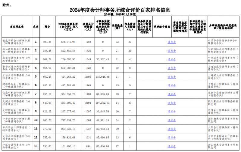 中注协发布2024会计所综合评价百家排名信息(公示稿)